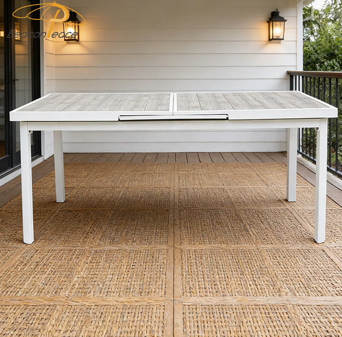 This BP8522 extendable outdoor dining table features a powder-coated aluminum alloy frame paired with a poly-wood tabletop. The aluminum frame is rust-proof, corrosion-resistant, structurally stable, and highly durable, while the poly-wood tabletop authentically replicates the natural texture of wood while offering superior water resistance, weather resistance, and fade resistance. Its smooth extension mechanism allows for flexible adjustment of the tabletop size, effortlessly accommodating both everyday dining and larger gatherings. With its simple, sleek aesthetic, the table complements a variety of outdoor settings—such as courtyards and patios—making it an ideal choice for an outdoor dining table that combines both practicality and sophisticated style.