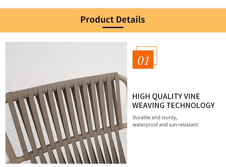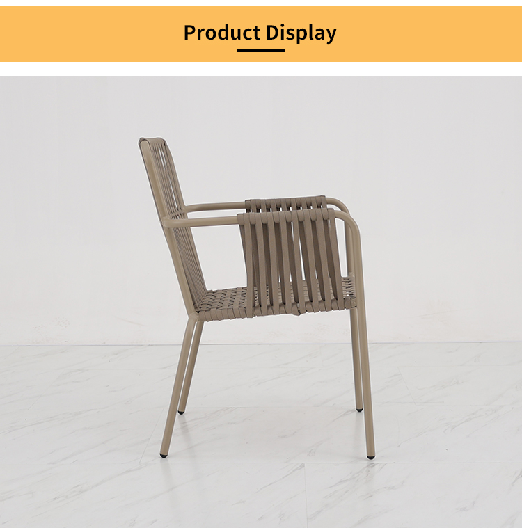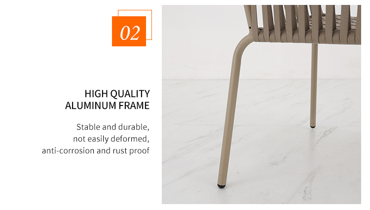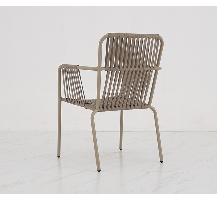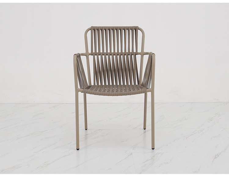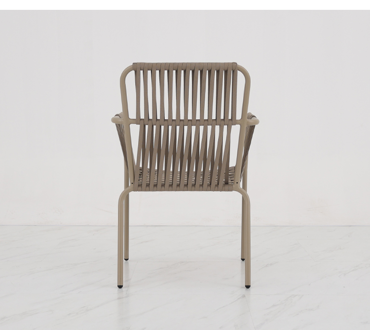 This outdoor aluminum alloy chair features a sturdy aluminum frame, comfortable armrests and backrests, and a simple yet stylish design. The seat, backrest, and armrests all utilize exquisite rope weaving, providing a unique tactile feel and elegant visual appeal. Whether for leisure time or social gatherings, it adds comfort and sophistication to your outdoor space. Sturdy, durable, and comfortable, it makes every moment outdoors truly enjoyable.