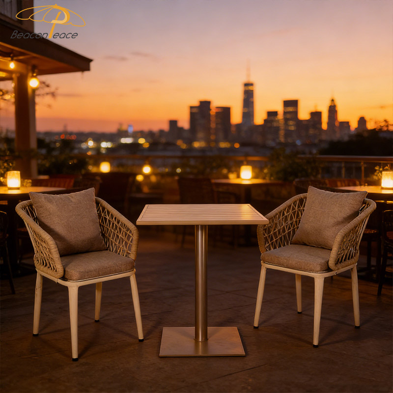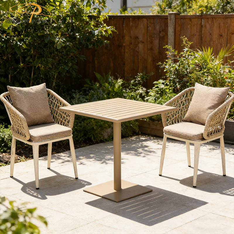 This BP1629&2041 outdoor three-piece set, consisting of one table and two chairs, features a lightweight yet sturdy aluminum alloy frame with excellent corrosion and rust resistance, ensuring long-lasting durability. The woven rattan backrest design is breathable, preventing stuffiness, and combined with soft cushions, provides exceptional comfort even during prolonged sitting. Its compact design is perfect for balconies or patios, adding a touch of comfort and practicality to your outdoor space, whether you're enjoying a light breakfast in the morning or a drink in the evening.