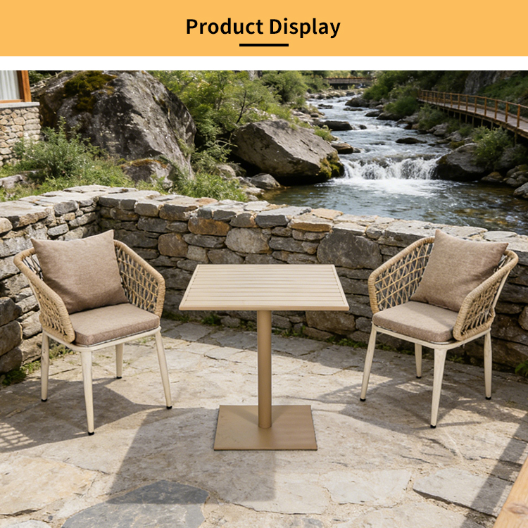 Table:aluminum frame with powder coated finish Chair:aluminum frame+outdoor rope weaving+waterproof cushion |