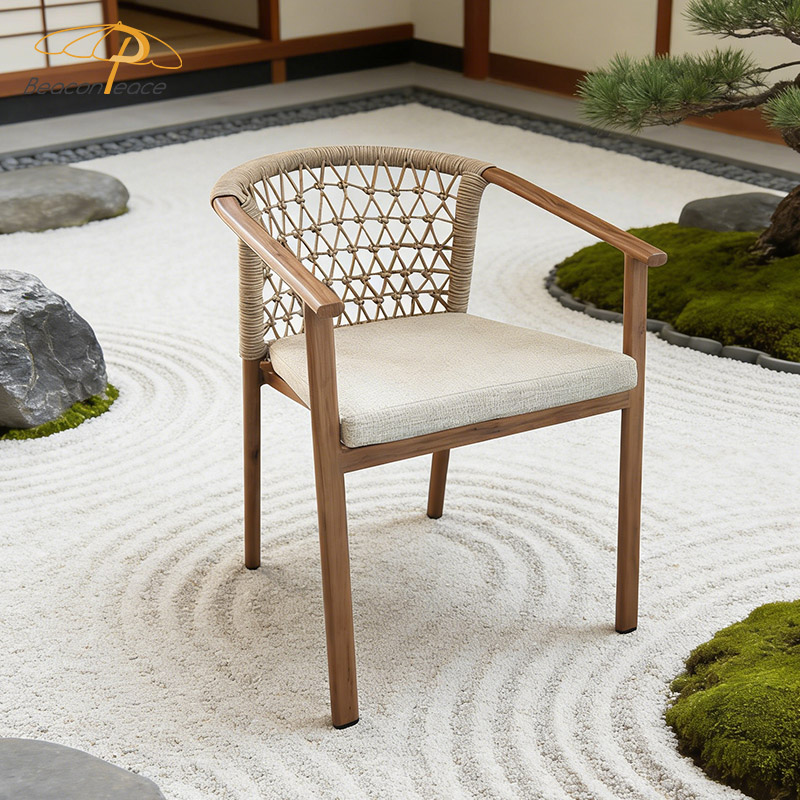 BP8467 Modern Wooden Grain Heat-Rransfer Aluminum Frame Stackable Outdoor Garden Dining Chairs with Rattan DecorMOQ :