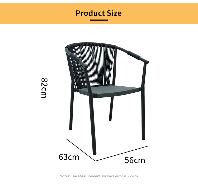 This outdoor dining chair features a sturdy aluminum frame with delicate braided rope details, adding a touch of natural elegance to your patio, balcony, or terrace. The robust aluminum alloy material is not only lightweight but also corrosion-resistant and weather-resistant, ensuring its lasting beauty and stability in various outdoor environments. The chair's design includes added armrests for enhanced comfort and support, providing extra comfort whether you're relaxing for a nap or enjoying a meal. The high-quality waterproof seat cushion offers unparalleled comfort; the waterproof material not only prevents water penetration and is easy to clean but also keeps you dry and comfortable for extended periods.