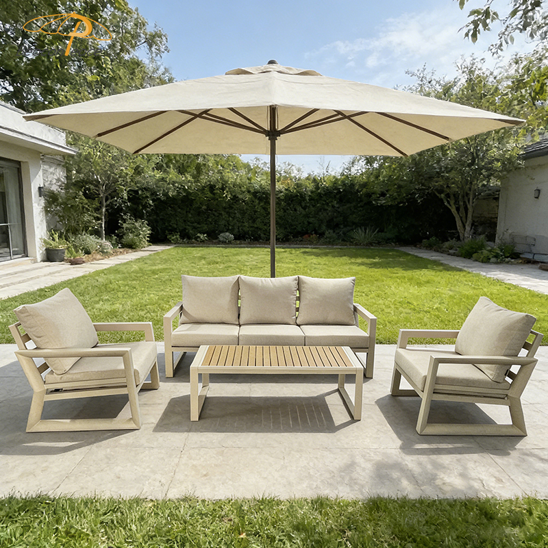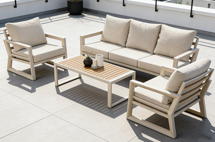 This BP8521 outdoor sofa set features a sturdy aluminum alloy frame that is corrosion-resistant, rust-proof, lightweight, and durable—standing up effortlessly to the rigors of outdoor sun and rain. The accompanying coffee table is topped with a high-quality poly-wood surface, offering a natural texture that is both wear-resistant and easy to clean. Complete with high-resilience, waterproof seat and back cushions, the set provides a plush, comfortable seating experience while remaining moisture-proof and weather-resistant. Easily adaptable to various outdoor settings—including courtyards, patios, and balconies—this set helps you create a durable yet comfortable outdoor leisure space that stands the test of time.